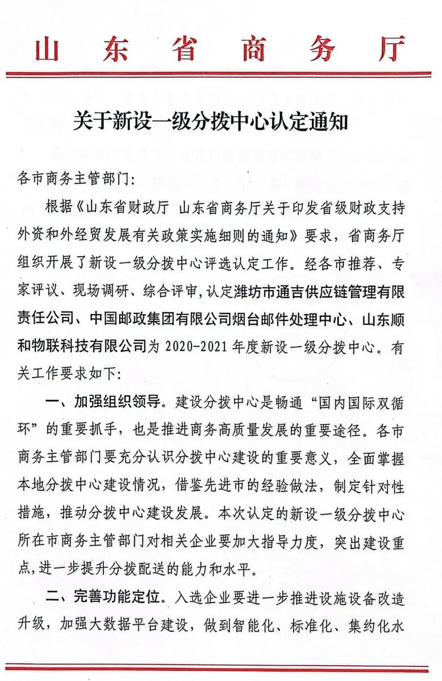 熱烈慶祝山東順和物聯(lián)科技有限公司被山東省商務(wù)廳評選為“2020-2021年度新設一級分撥中心”。